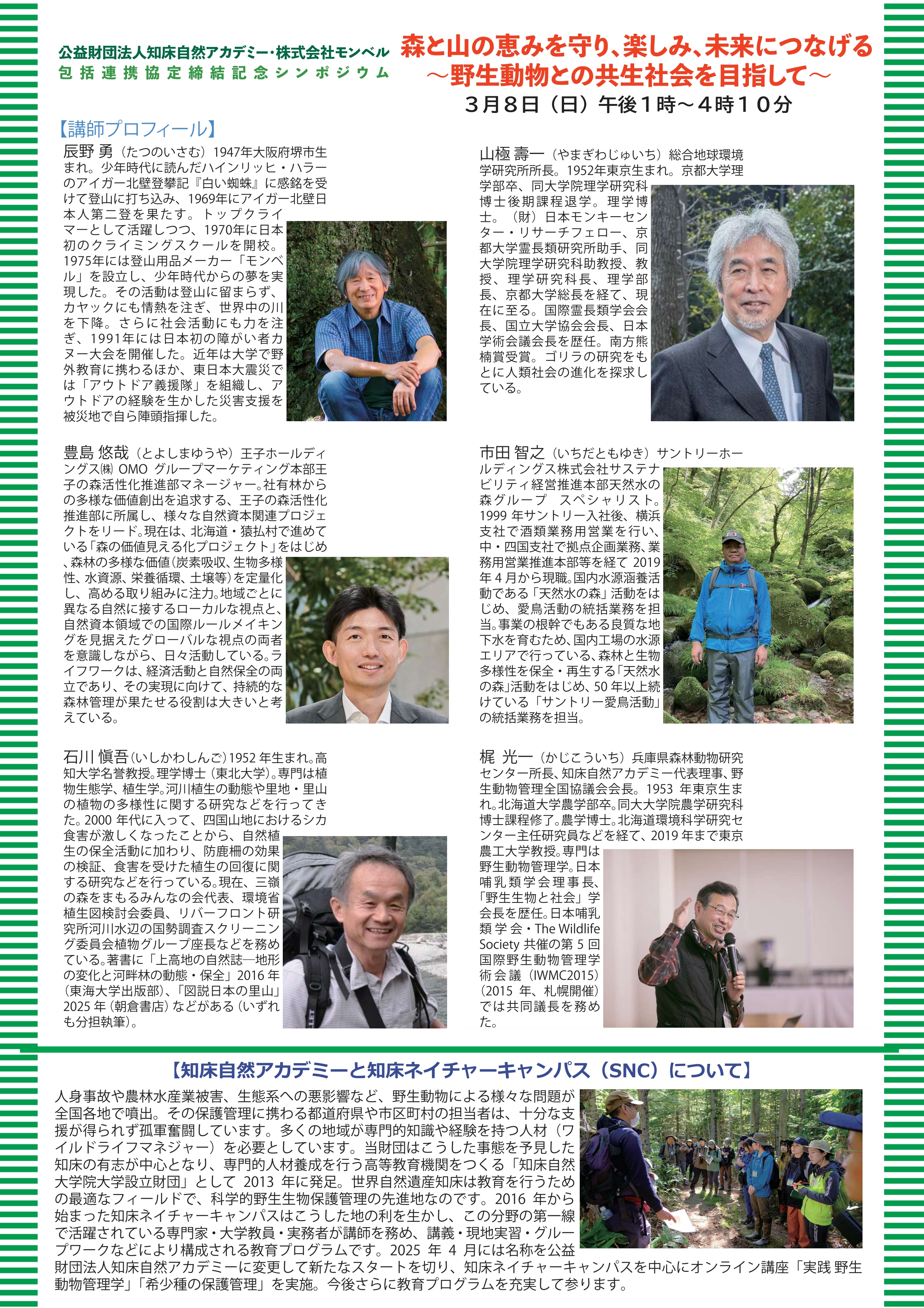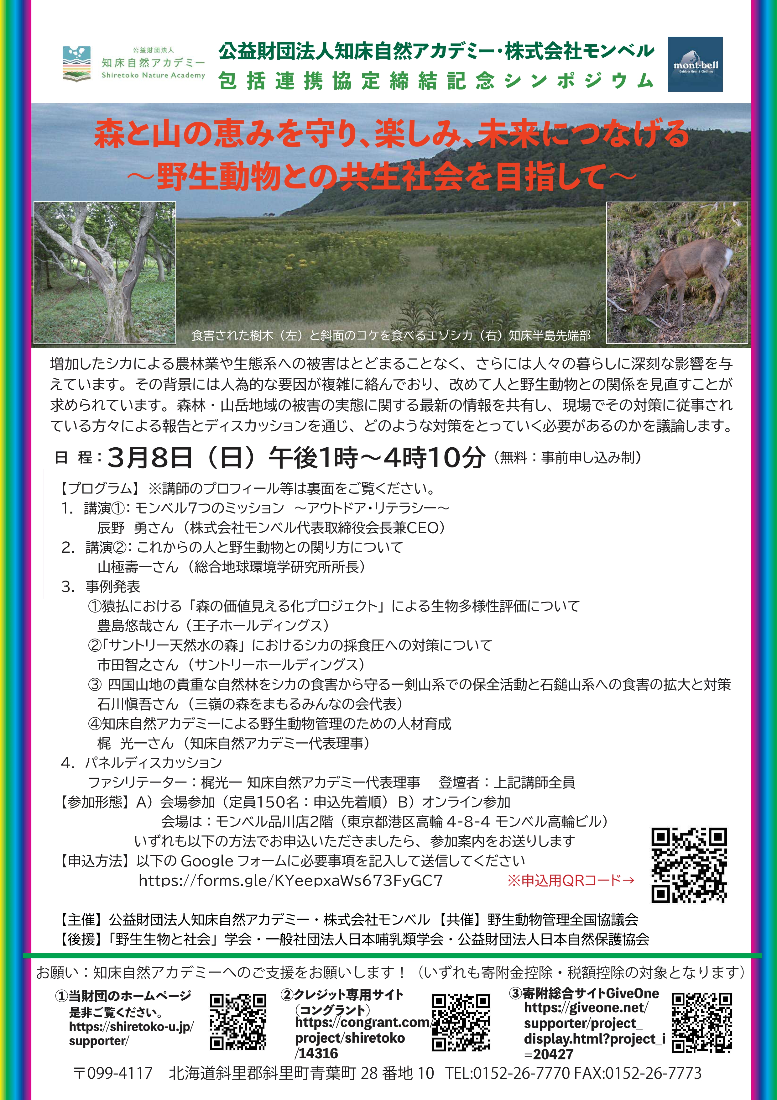 公益財団法人 知床自然アカデミーと株式会社モンベルとの包括連携協定を記念したシンポジウム「森と山の恵みを守り、楽しみ、未来につなげる ~野生動物との共生社会を目指して~」を3月8日(日)午後1時より、モンベル品川店2階(東京都港区高輪4-8-4 モンベル高輪ビル)にて開催いたします。このシンポジウムの参加者を募集します。グーグルフォームhttps://forms.gle/KYeepxaWs673FyGC7からお申込みください。詳細は以下のチラシをご覧ください。お問合せはshiretokodaigaku@gmail.comまでお願いします。