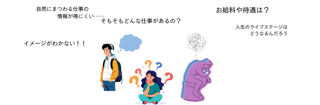 自然に関わる仕事はキャリアが多様で、情報収集が難しい傾向にあります。自然系のキャリアが未経験のうちは具体的なイメージが持てず、キャリア選択において期待だけでなく不安にも駆られることが少なくありません。
